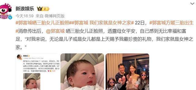 10月22日下午18:53分,天王郭富城在社交平台正式官宣了妻子方媛三胎产女的喜讯。 并发文说“我们的小公主终于到家了,母女平安。感恩所有。”瞬间引爆热搜!